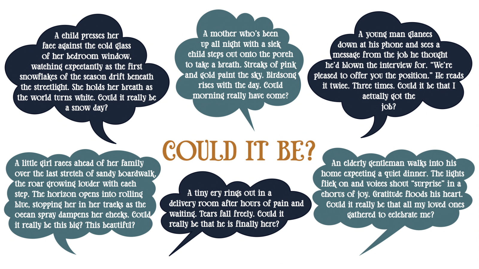 We all know these moments in our own lives... moments of such relief or good news that our initial reaction is disbelief. After a long season of being so immersed in waiting, in worry, in suffering, or in longing, when Good comes our way we have to pause and do a quick reality check: “Is this really happening? After all this time? It almost feels too impossible, too wonderful to be true.” At the first signs of dawn breaking into the shadowy spaces of our lives, it’s as if wonder startles us awake and stirs our hearts to ask one of its most hopeful questions: Could it be?!