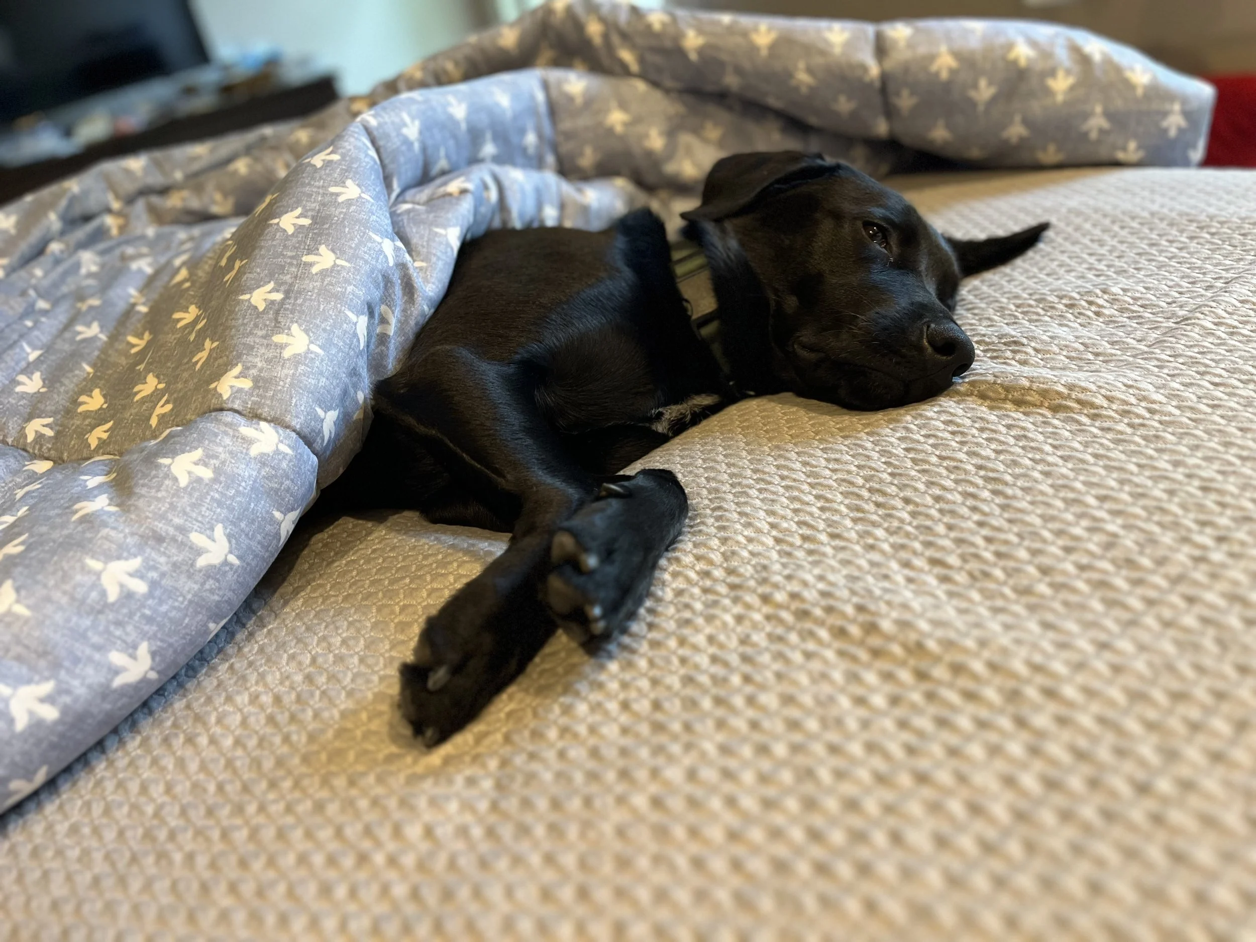Three times this Spring, Kal got loose and ran away from home in pursuit of rabbits in the yard. All three times, the bunnies—and Kal—darted behind the house, down into the creek bed that parallel’s the city bike trail. The creek bed is a densely wooded area with downed trees, tall grass, and LOTS of mud. The first time Kal got loose, he was hot on the trail of 6 rabbits. If one rabbit zigged and Kal zagged, then Kal just continued his pursuit of one of the other rabbits. He was running full speed through the bramble with nothing but “rabbit season” on the brain. Once we finally got Kal called off the rabbits and caught him, we were looking him over and saw that he was bleeding in a couple places from having sprinted face-first through piles of sticks. After a trip to the emergency vet (because of course these sorts of things only happen after-hours), Kalmar was back in the comfort of his home.